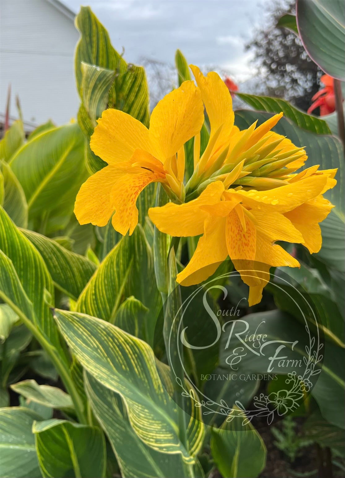 Canna 'Golden Tiger,' has rich golden flowers and narrow pinstriped foliage. More determinate in growth, compared to other tigers, preferring to cluster, rather than spread. A medium variety, it will grow about 5-6ft in height.