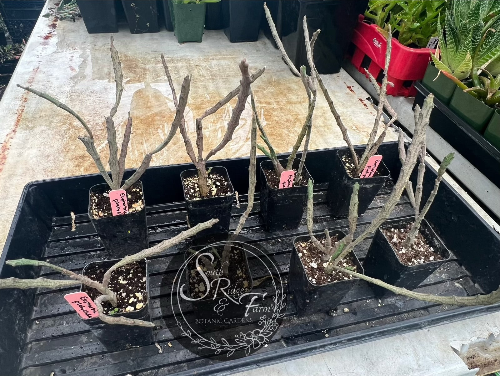 Euphorbia platyclada, is a unique succulent from Madagascar with pinkish-brown, leafless stems and insignificant flowers. Often referred to as “[a] dead plant,” it prefers dry, well-drained soil, bright indirect light, and plenty of neglect.